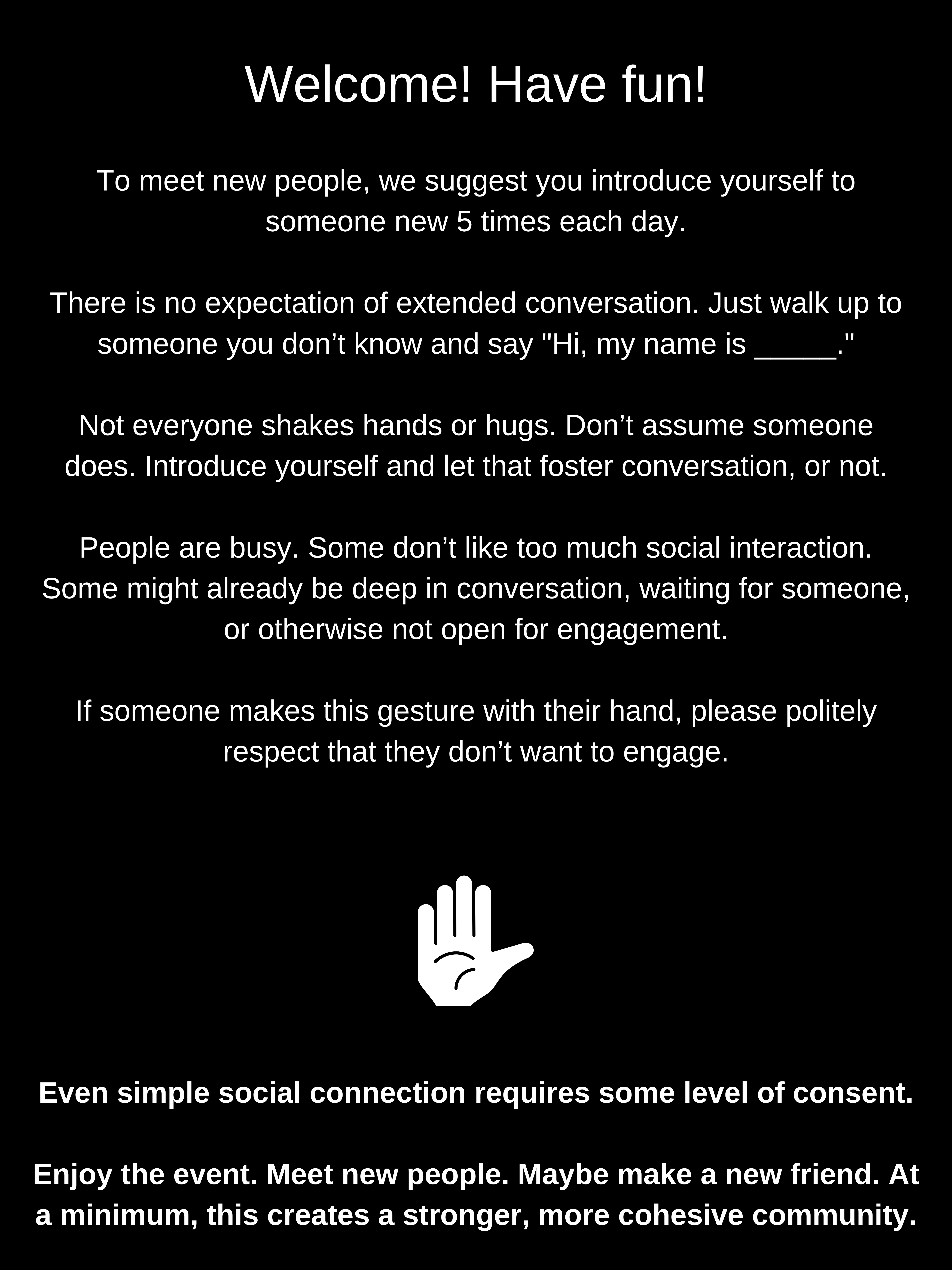 Welcome! Have fun. Meet new people.